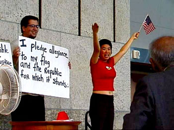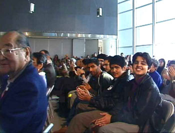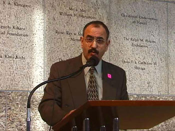 Over 300 filled the JANM George and Sakaye Aratani Central Hall in Little Tokyo for the two-hour program that mixed speakers and performances and also honored redress activist Isamu Carlos Arturo Art Shibayama and the Korean Immigrant Works Advocates (KIWA). Tritia Toyota and Christina Shigemura co-hosted. Shibayama, recipient of this years Fighting Spirit Award from the Nikkei for Civil Rights and Redress (NCRR), is challenging the U.S. government in a lawsuit, Shibayama v. Reno, in an ef-fort to obtain reparations on behalf of Japanese Latin Americans affected by the wartime hysteria. KIWAs ongoing efforts to empower Korean immigrant workers were rec-ognized with the Pacific Southwest Japanese American Citizens Leagues Community Achievement Award. Speakers and performers linked the Sept. 11 terrorist attack and the WWII internment, but a group of young ac-tors, known as Zero 3, Performance artist/character actor Shida Pegahi, and a stage artist named Denise Uyehara managed to bring the days commemorative events to an emotional peak with their dramatic interpretations. Zero 3s Kennedy Kabasares, Traci Kato-Kiriyama, and Edren Sumagaysay revisited their per-sonal Sept. 11 experiences, while Ms. Uyeharas blended wit and pathos to ex-plore issues facing Nikkei, Arab Amen-cans -and Muslims. The world cannot be divided into two societies, one for rebels and one for the officers of the law, reminded keynote speaker Michel Shehadeh, Western Regional Director of the American-Arab Anti-Discrimination Committee (ADC). Calling the internment of persons of Japanese ancestry a classic case of unlawful racial profiling, Shehadeh said he looks to the Japanese Ameri-can experience for inspiration. They found the strength to cling to hope. ADC is a civil rights organization committed to defending the rights of people of Arab descent. Shehadeh is one of the LA 8, eight Palestinians and one Kenyan arrested in 1987 for their alleged affiliation with the Popu-lar Front for the Liberation of Pales-tine (PFLP). No criminal charges have ever been filed against them. Since then, the eight have successfully fought off government efforts to deport them.