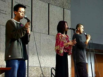 Coming off of their successful one-night performance at the UCLA Armand Hammer Museum in december, Zero 3 performed a new spoken word piece focusing on their observation of the media-fueled frenzy after the September 11 attacks. Zero3 is made up of Kennedy Kabasares, Traci Kato-Kiriyama and Edren Sumagaysay. The trio made their debut in April 2000 at the Japanese American Cultural and Community Centers Fresh Tracks series at the David Henry Hwang Theatre in Little Tokyo. Since then, Zero 3 has been performing in various venues across Southern California including the Vogue Theatre in Hollywood, the Natural History Museum in Los Angeles and Highways Performance Space in Santa Monica.